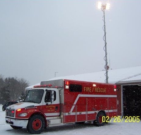 Purchased used from the Moyer Corners Fire Department (New York) in 2009. 4-1 carries 1300 feet of 5 inch hose, 1000 gallons of water and a 1500 GPM Hale two stage pump. Manpower on 4-1 consist of a pump operator, officer w/ SCBA, 2 SCBA in 911 Seats and a fifth and sixth person in the rear. It carries 4 pre connected hand lines - one 200' 1 3/4" attack line, two 200' 2" attack line and a 200" 2-1/2 attack line all equipped with TFT Variable Stream / Variable Flow nozzles. There is a pre-connected deck gun above the pump panel. It also has 200' of 3 1/2 inch hose with a gated wye for incident where the apparatus is force to be farther than 150 feet away.